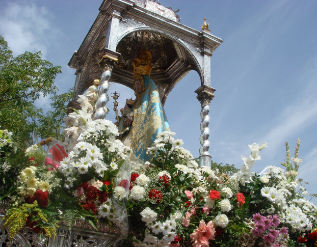 La Romería se realiza desde el pueblo hasta el santuario de la Virgen, que se encuentra a cinco kilómetros de Alcalá. El santuario se remonta al siglo XIV, aunque el edificio que podemos ver hoy día se reestructuró en el siglo XVII. La capilla está presidida por el camarín donde se halla la Virgen, con la mayor colección de exvotos de toda Andalucía. De las paredes del santuario cuelgan todas las gracias que los fieles de la Virgen han ido dejando allí, como signo de agradecimiento por alguna petición cumplida. La devoción a la Virgen data de la histórica Batalla del Salado, en la que los alcalaínos pidieron protección a Nuestra Señora de los Santos, para que intercediera por ellos. Respecto a su autor y origen, nada se sabe con certeza, aunque abundan las historias y leyendas. La Virgen se viste con los llamados «mantos», posee bastantes de diferentes colores y valor, de donaciones personales. Existe una antigua tradición que es meterse debajo del manto de la Virgen para conseguir su protección. Tiene la Virgen multitud de joyas y objetos de oro que a lo largo del tiempo ha ido recibiendo como regalos. La imagen de la Virgen se encuentra sobre unas andas de plata realizadas en 1675.