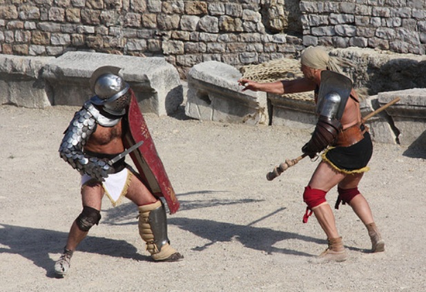 Los romanos revistieron a sus combatientes de armaduras samnitas y organizaban combates rituales en los funerales de ciudadanos distinguidos. Las armaduras samnitas hacían del combate algo lento y prolongado, con notable efusión de sangre. Un espectáculo poco vistoso, que los romanos irán refinando.
