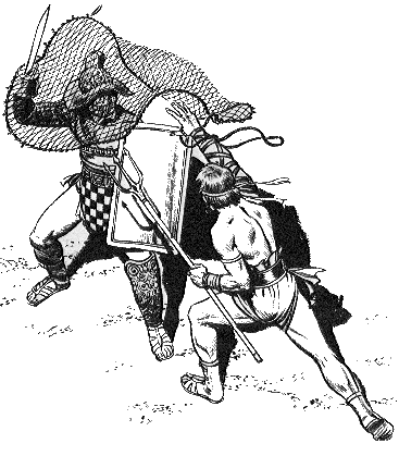 Los retiarii iban desnudos, sin más protección de su red y como armas un puñal y un tridente, con el que podían poner a raya a sus rivales, normalmente los acorazados secutores de armadura, escudo y espadas.