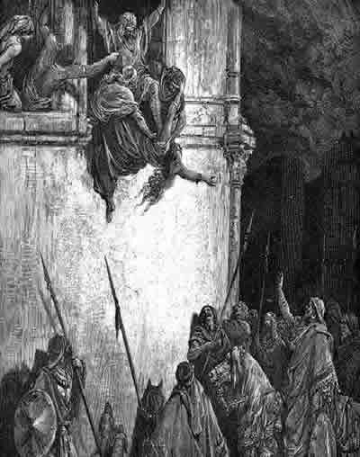 Jehú, mandó a unos eunucos que la tiraran desde su ventana y (2 Reyes 9, 33-37) «quedó salpicada la pared con la sangre y pisáronla los pies de los caballos»