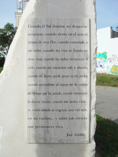 Después de esquivar y rodear los dos un lúgubre sitio impregnado de dolor, miedos, angustias y sufrimiento en el que se escuchan los lamentos de una mujer muy joven, tira de él José Monge Cruz y llevándolo a uno de los rincones del parque donde hay un escrito sobre piedra que le hace leer en voz alta, un par de repetidas veces.