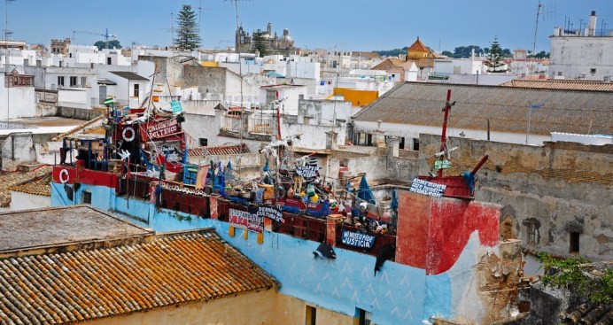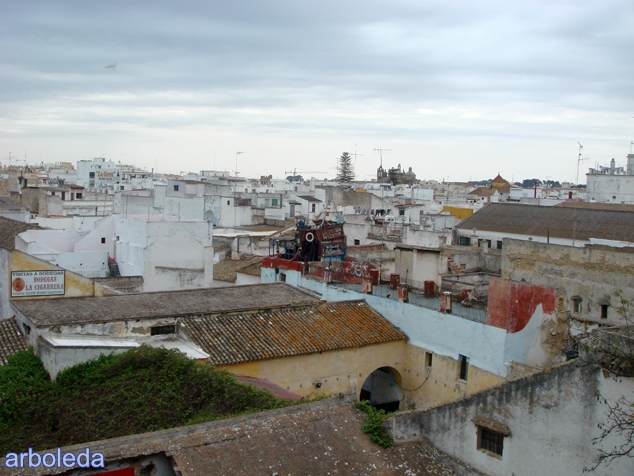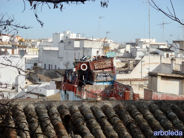 Aquí se puede conocer el porqué de la idiosincrasia marinera. Desde lo alto del casco antiguo podemos contemplar el bosque de tejados de Sanlúcar y lo que este señor había convertido en la cubierta de un barco, con sus velas, su timón.