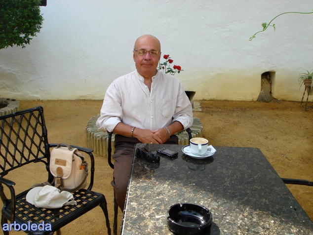 La señora se sienta a la mesa en donde me encuentro. Sacando y encendiendo ella un pitillo (no sabía que en la otra vida se permitía fumar), entabla conversación. Tiene las piernas entrecruzadas, una mano descansa sobre su regazo mientras su cuerpo está inclinado hacia adelante. Su voz es clara, agradable, con rico vocabulario, se nota acento del sur más aires de marisma. Viste pantalón, una blusa y a pesar del calor tiene sobre si una rebeca. El calzado es plano y de piel, sin ninguna floritura. Su cabello lo lleva muy cuidado resaltando un especial brillo. Las manos son huesudas y acompaña las palabras con ellas. Sus dedos tan solo transportan una sola y discreta sortija, son largos y diáfanos.