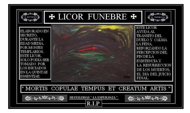 Pero si debo hablar o nombrar mi “última” bebida, la cual tengo a buen recaudo, es el “LICOR FÚNEBRE”, cuya etiqueta adelanto. De su contenido debe usted abstenerse por el momento, recuerde que la curiosidad mató al gato.