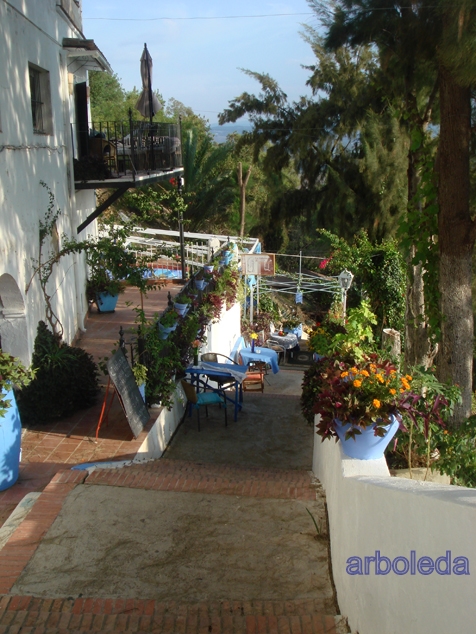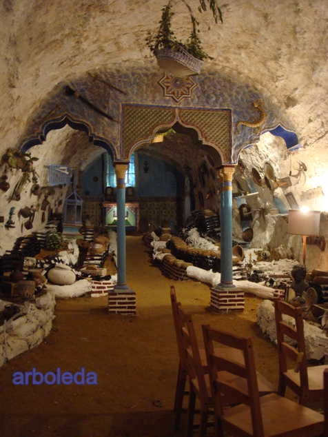Aún bajo la impresión de lo encontrado en una puerta de la sacristía, y dando vueltas con revueltas al posible significado (simbología) de la tiara papal y la calavera, entre dos tibias mas una rota, sin pasar por alto las cintas y el número de dientes en la propia calavera, me entremezclo con el sonido de los adoquines yendo a parar en un recoveco en lo que fueron unas cuevas que guardaban las antiguas caballerías del castillo, hoy recicladas en un jardín de sensaciones gastronómicas: La Taberna de Boabdil.