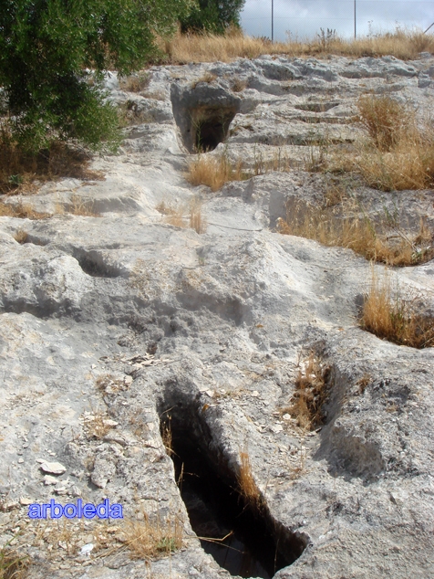 Estoy en un santuario rupestre al aire libre del II milenio antes de nuestra era. El yacimiento en sí, está en un lugar en donde la roca caliza sobresale de la superficie originando una pared. Sobre esta pared se tallaron las entradas de acceso a los enterramientos que se conocen como hipogeos.