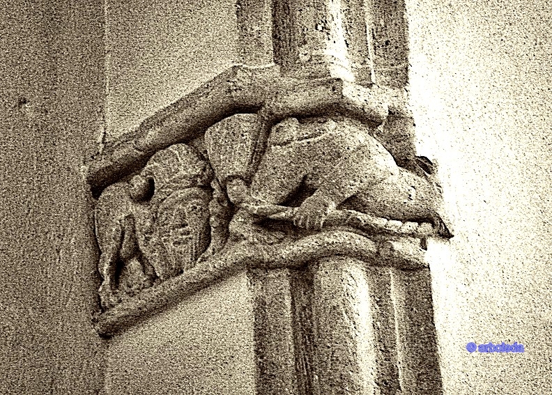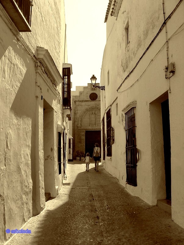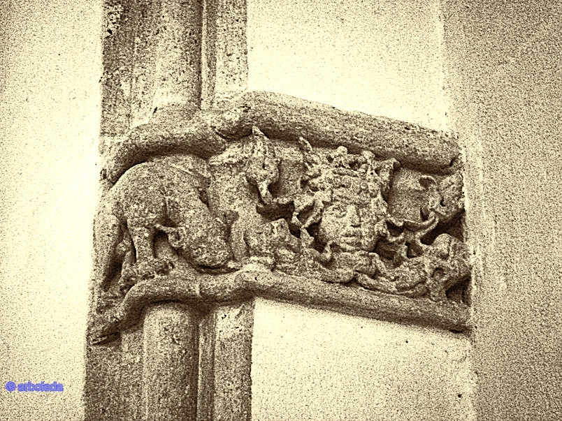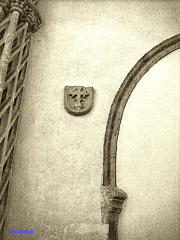 Con su portada de estilo gótico en su interior guarda esculpidos en capiteles, los dos únicas figuras que se conservan de los marqueses de Cádiz. Son dos pequeños bustos escoltados por un friso de animales alegóricos, D. Rodrigo Ponce de León aparece con barba y puntiaguda, melena, cuerpo y garras de león y gorro en la cabeza; Dña. Beatriz ostenta corona de marquesa, cetro y rueca.