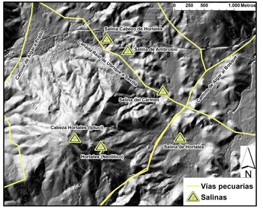 Las salinas de Hortales son unas de las últimas salinas de interior que se mantienen en funcionamiento en Andalucía. Su actividad está documentada desde el s. XIV durante el reinado de Alfonso XI pero se debían estar explotando desde mucho antes, como lo atestigua el asentamiento de Iptuci, que data de la Edad de Bronce, y que se ha mantenido en época púnica, romana y musulmana, y que, lógicamente, aprovechaba estas salinas.