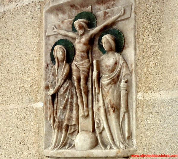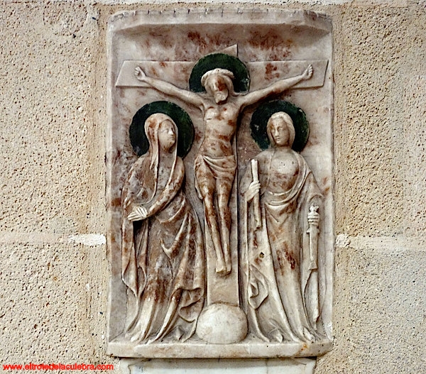 La pasión de Cristo es uno de los temas más recurrentes en la producción de alabastros, sobre todo a partir de una etapa intermedia, de 1380 en adelante. En este panel están representadas solo las figuras Cristo en la Cruz, la Virgen y posiblemente san Juan Evangelista. La cruz descansa sobre una esfera que aporta a la divinidad de Cristo el significado de la totalidad, el infinito, lo único y uno.