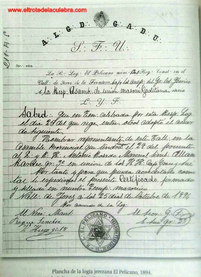 El Gran Oriente de España conseguía implantarse de nuevo en Jerez hacia 1884 con la fundación de una logia denominada Guadalete N.º 270. Su núcleo fundacional lo formaron 13 hermanos, predominados los que tenían profesiones liberales, médicos, abogados o profesores de primera enseñanza. A este grupo se le unió otro de una procedencia socioprofesional algo más variada formado por propietarios, industriales y empleados.