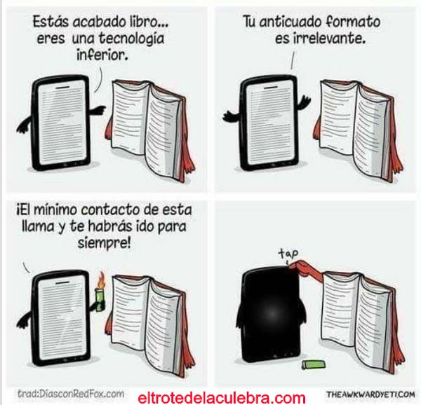 Para algunos seres, sería horrible una estantería blanca y de pronto, en una esquina, un artilugio en el que caben dos mil libros. Para estos alienígenas del futuro-presente, fósiles en el mañana, si no hay libros, libros físicos, libros verdaderos, tangibles, con sus portadas y sus títulos, y su olor, se rompe la vida, y no hay que “romper la vida” renunciando a “otros diálogos posibles”.