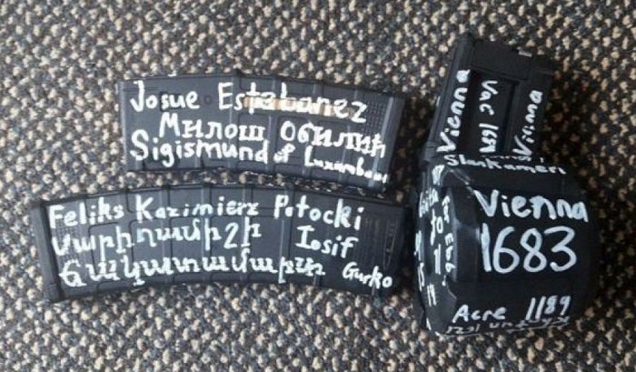 Le sigue Segismundo de Luxemburgo, un noble europeo que entre finales del siglo XIV y principios del XV acumuló títulos como el de emperador del Sacro Imperio Romano Germánico o el de último emperador de la Casa de Luxemburgo. Tarant incluyó símbolos como el del Sol Negro, antiguo ícono germánico que luego fue adoptado por los nazis. También dibujó una versión supremacista blanca de la cruz celta y un símbolo vikingo.