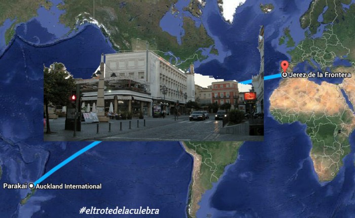 La distancia de Jerez de la Frontera a Parakai es de cerca de 20,000 kilómetros. Un viaje directo en avión tomaría alrededor de 22 horas, sin embargo, no existen rutas que cubran este trayecto. Regresar a pie lo veo muy crudo. Las antípodas de Jerez, se encuentran en las coordenadas geográficas S36°41’11.22″ E173°51’50.18″. Siempre es bueno saberlo por si te despistas saliendo de un tabanco (bar).