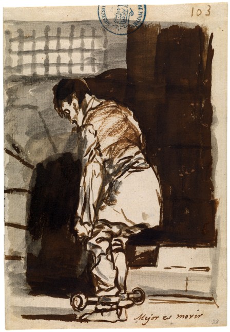 Era un mundo en donde la crueldad en el trato a los presos, las condiciones inhumanas de su cautiverio quedan subrayadas desde distintos puntos de vista. Por un lado, mediante la soledad del condenado, que se enfrenta de forma aislada a su condena; por otra parte, mediante la representación de un escenario claramente simbólico, en el que la cárcel se representa con espacios de arquitectura abovedada marcados por la oscuridad en contraposición a la luminosidad que se aprecia tras los barrotes. Pero además la postura del preso, forzada por los grilletes es también reveladora del desánimo que le embarga y que le lleva tanto a él como al observador –en este caso a Goya– a titular la situación con la lacónica frase «mejor es morir».