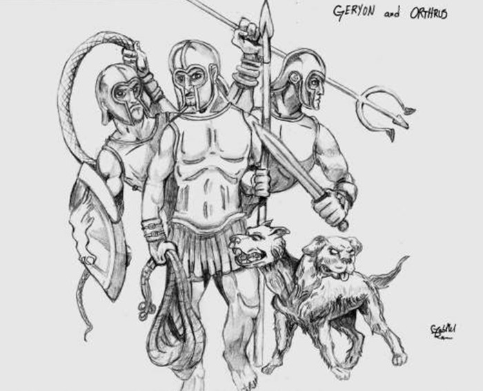 El trasfondo histórico del mito griego sobre el décimo trabajo de Heracles entremezcla las hazañas realizadas por los fenicios y por los griegos en occidente, y esta fusión de leyendas debió de ser elaborada originalmente por los rodios.