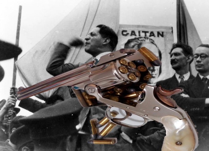 Dos balas certeras en la cabeza y dos en el cuerpo bastaron para cegar la vida de Jorge Eliécer Gaitán a la una y cinco de la tarde del 9 de abril de 1948. Pocos testigos se percatan del segundo tirador. Horrorizados los presentes están distraídos o centrados en Juan Roa Sierra que se deja detener mientras empuña un revolver fabricado en España modelo número 3 de Smith & Wesson.
