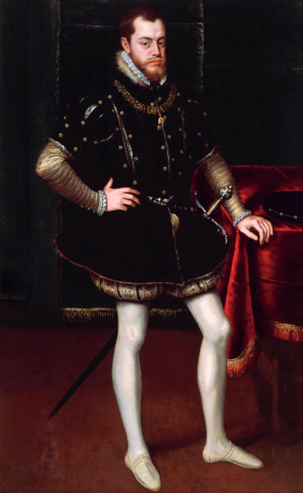 Durante el reinado de Felipe II, la Corte española era ejemplo de buen gusto. Los trajes sobrios y negros eran símbolo de elegancia y esta tendencia se contagió a los países vecinos. La moda era vestir a la española y este tono no faltaba en los vestidores de los nobles europeos. España exportaba el tinte negro recién descubierto en el Nuevo Mundo, obtenido del palo Campeche (España tenía el monopolio).