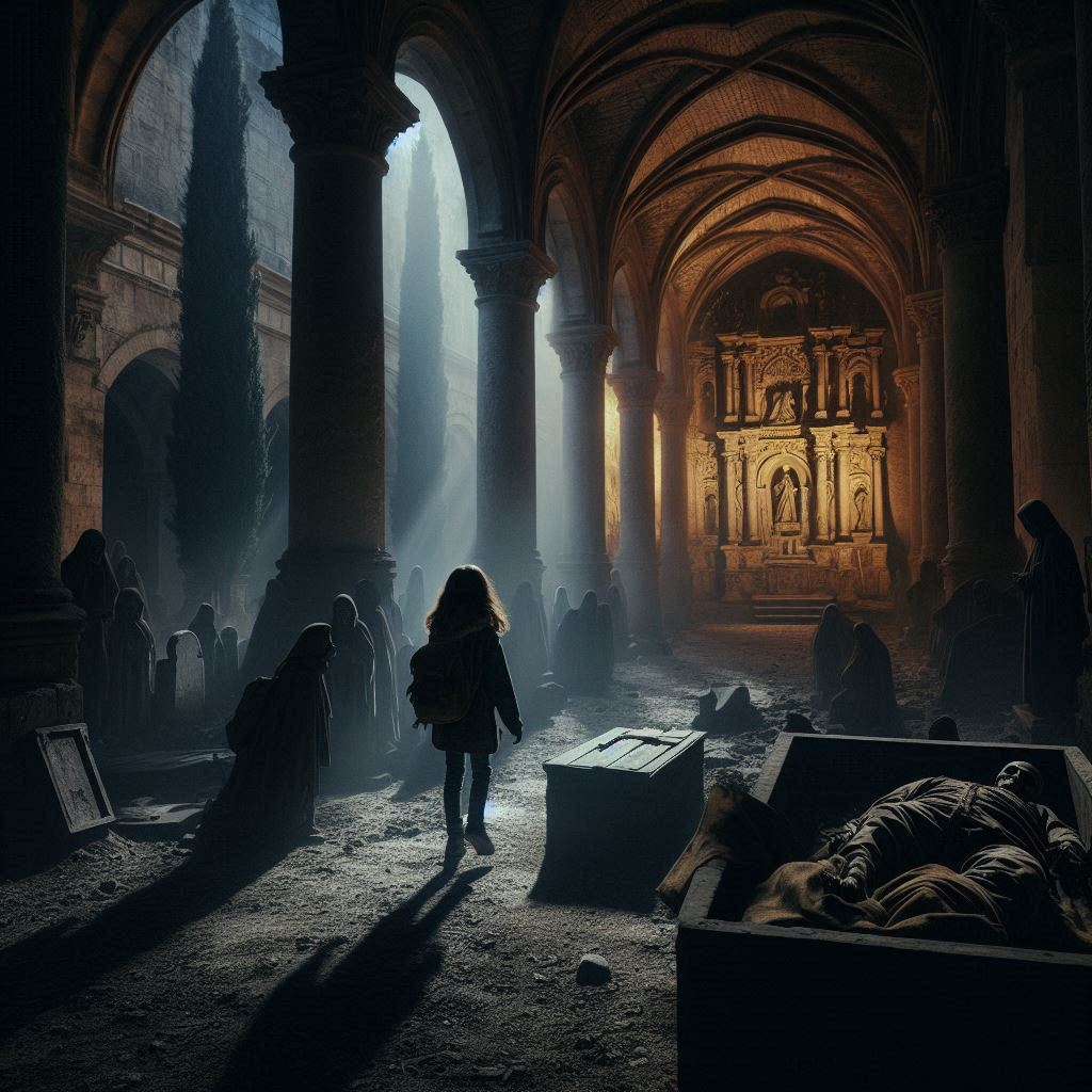 Un grito desgarrador surgió de las profundidades del convento, un eco del pasado que rompió el silencio sepulcral del lugar. La figura momificada en el altar comenzó a moverse, sus ojos vacíos se abrieron de golpe y un viento helado barrió la sala.