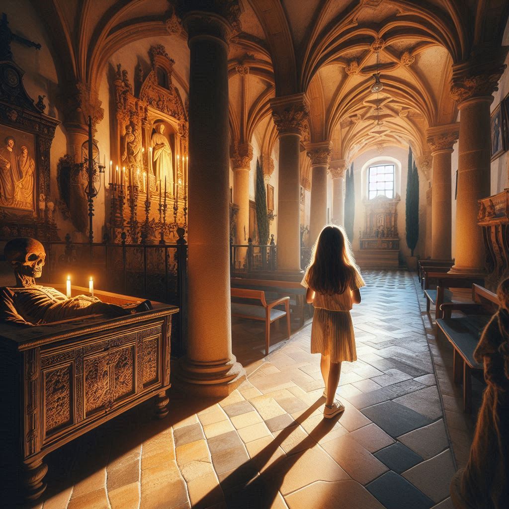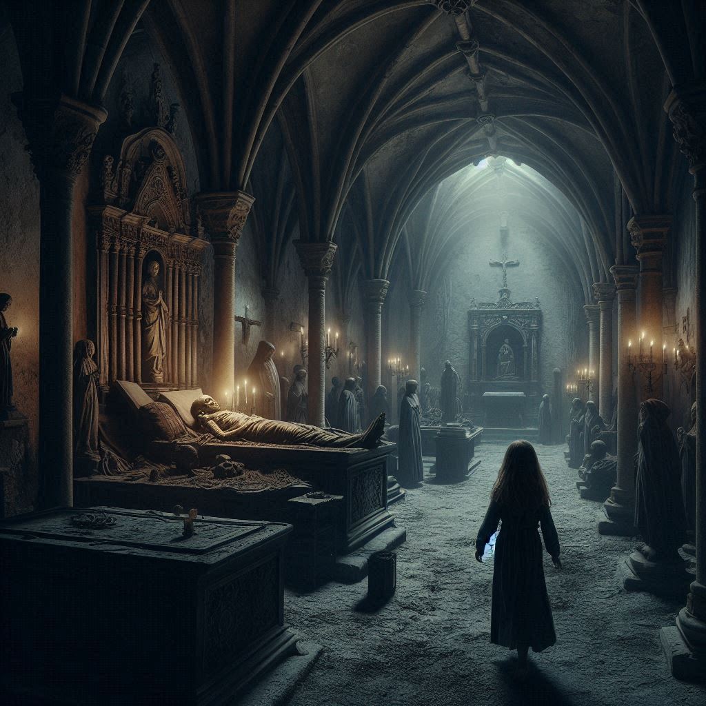 El miedo la paralizó, pero también la empujó a mirar más de cerca. Con el corazón latiendo desbocado, se acercó al altar y levantó el manto. Lo que vio la dejó sin aliento: bajo el manto, los restos momificados de una niña, vestida con un hábito similar al de las monjas, yacían en un eterno reposo. Un amuleto de plata brillaba en su cuello, y en su mano, un viejo crucifijo parecía aferrarse a la esperanza perdida.