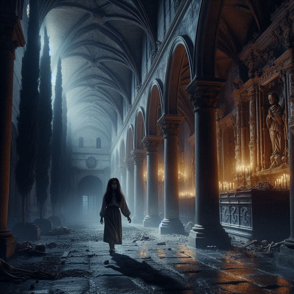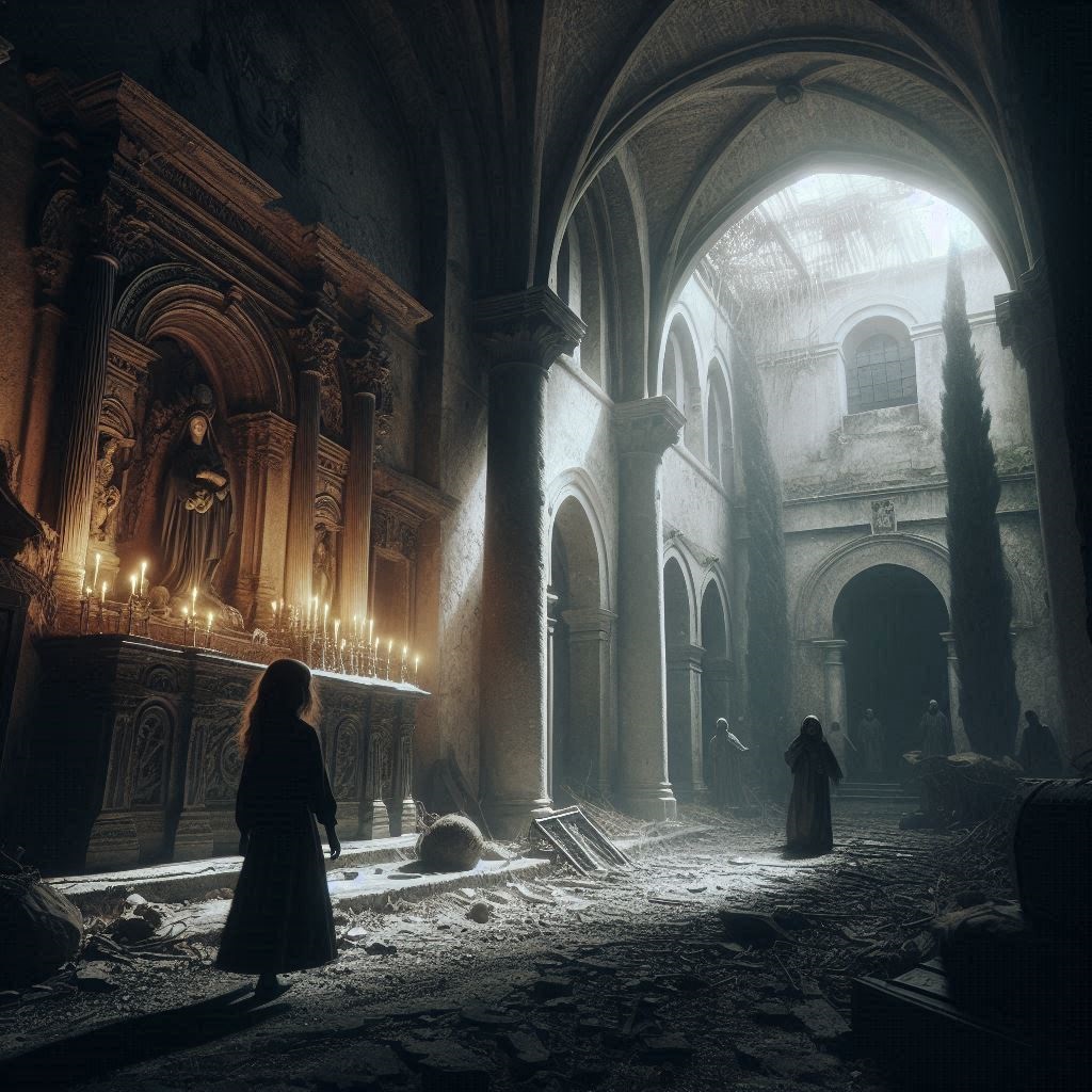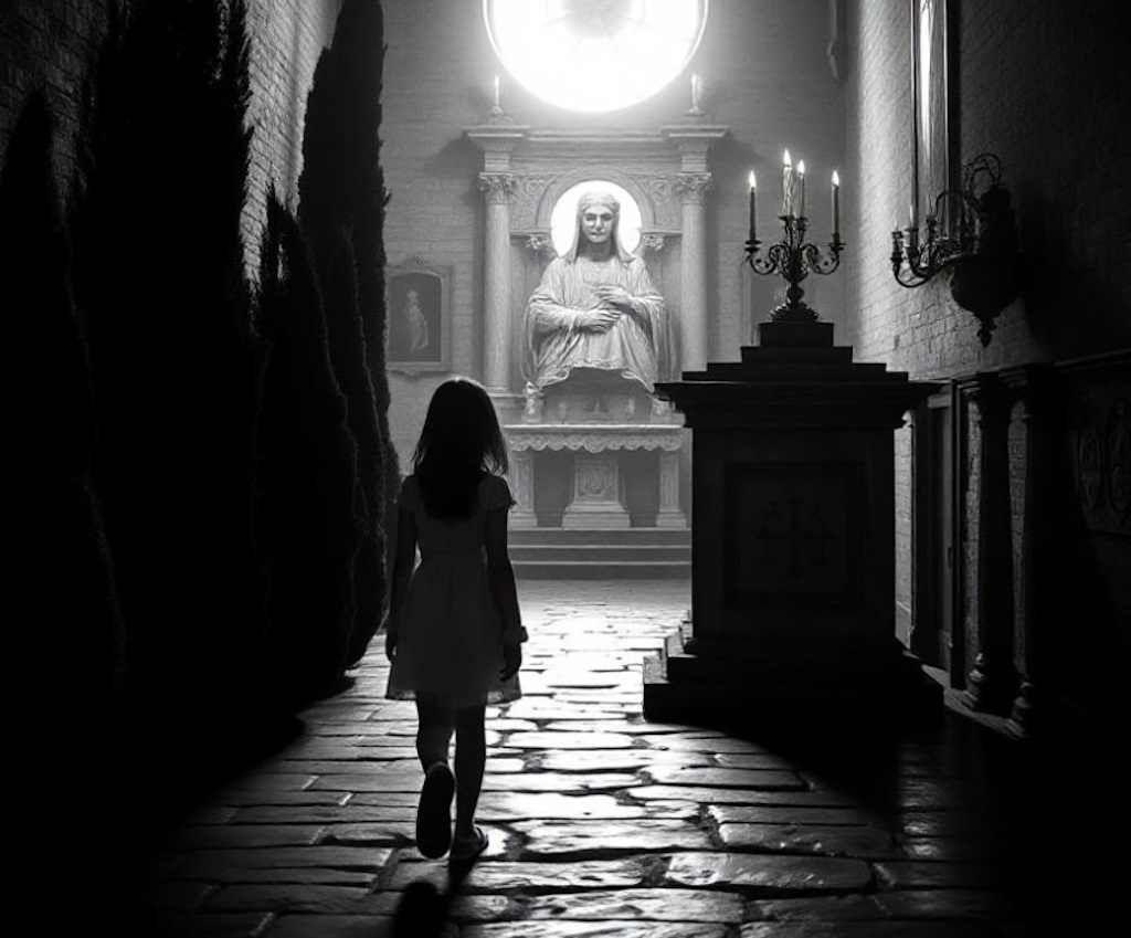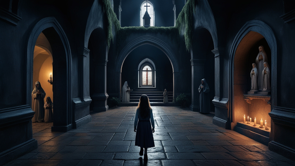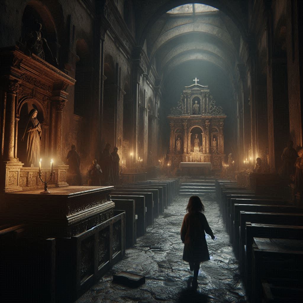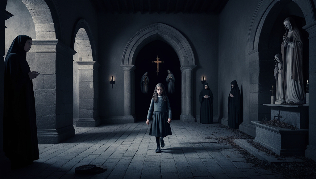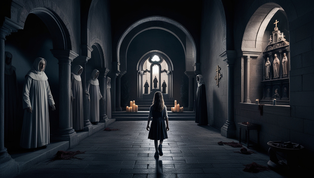 La Hermana Carmen intentó huir, pero el suelo bajo sus pies se abrió como una boca hambrienta, tragándosela en un torbellino de sombras. Inés gritó, sintiendo que el mismo destino la aguardaba, pero entonces, el viento cesó y todo quedó en silencio. La figura de la niña en el altar se desplomó de nuevo, inerte.