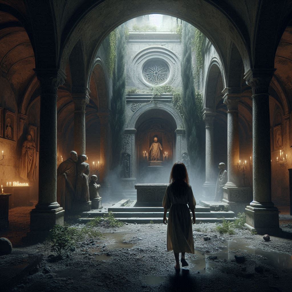 El sótano era una boca oscura que se abría en las entrañas de la tierra, un lugar donde la oscuridad era tan espesa que se podía tocar. Estaba sumido en la oscuridad, solo iluminado por la tenue luz de su vela. Las paredes estaban cubiertas de moho, y en el centro de la sala había un antiguo altar rodeado de símbolos extraños tallados en la piedra. Sobre el altar, una figura cubierta con un manto oscuro parecía vigilar el lugar, su rostro oculto en las sombras.