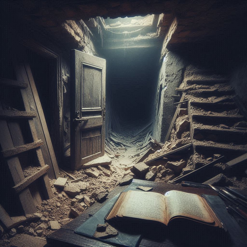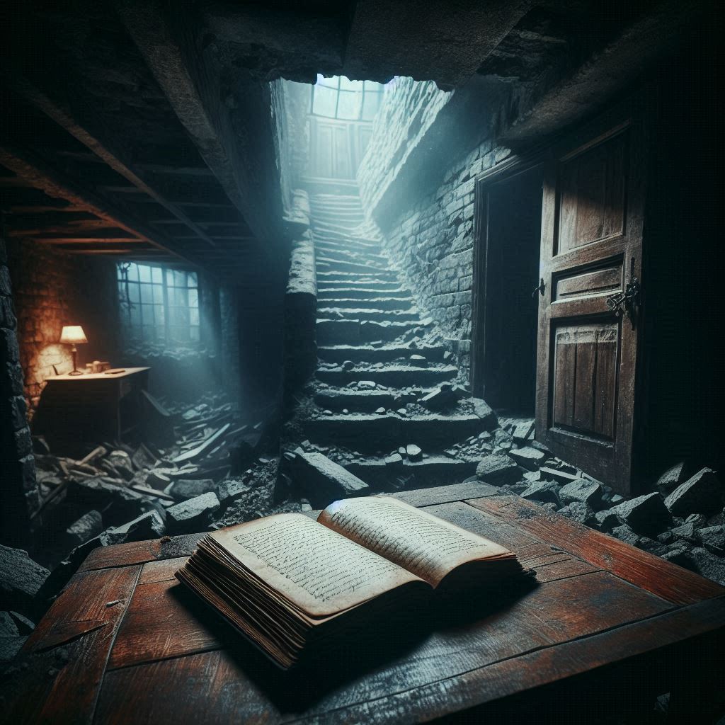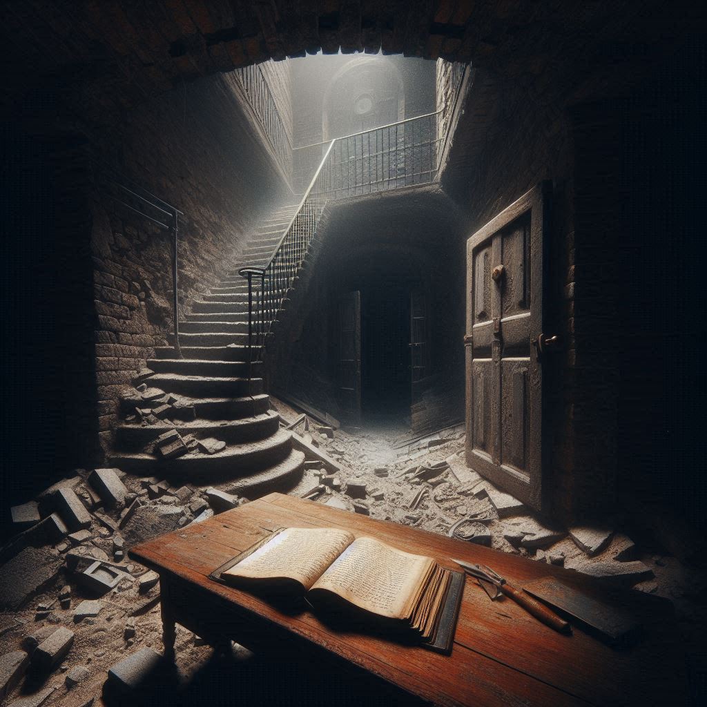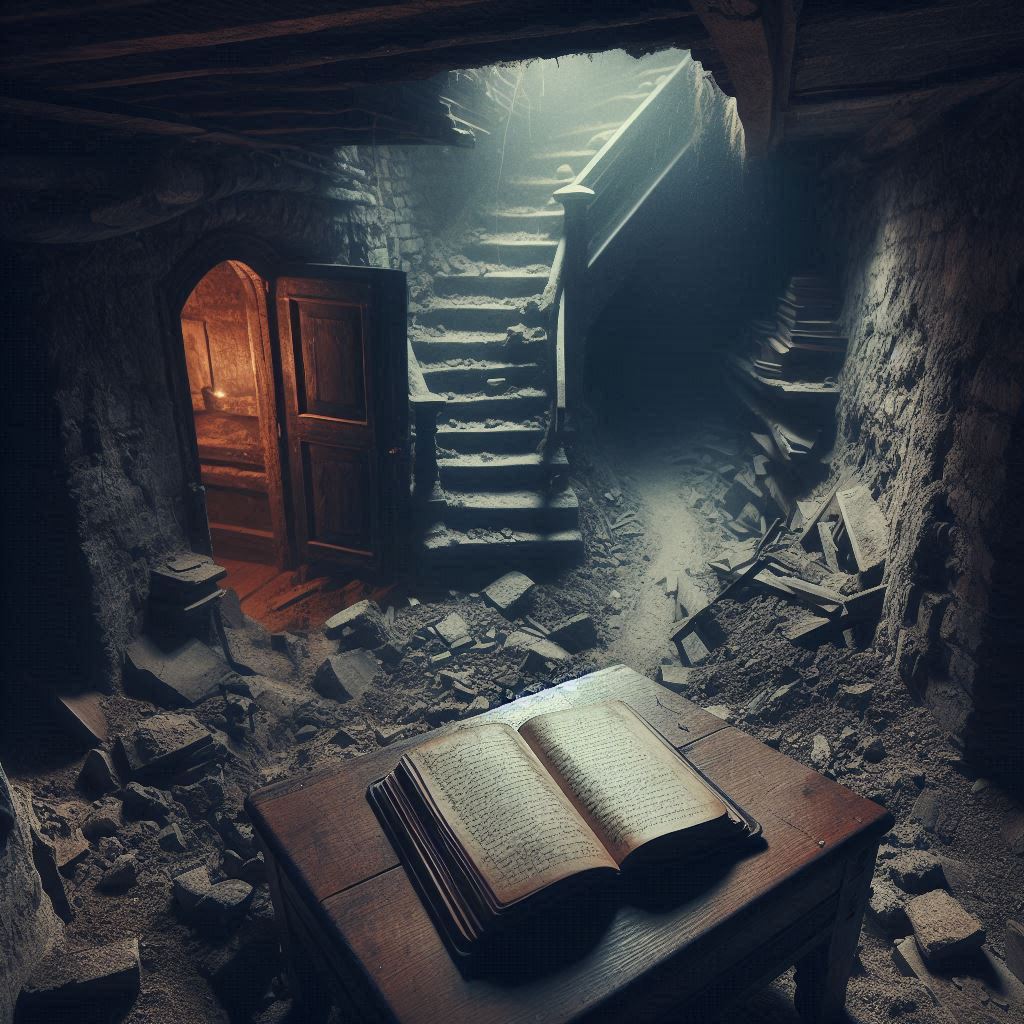 Al fondo del sótano, semioculta por un montón de escombros, había una puerta pequeña y vieja, que no figuraba en los planos. Intrigado, Francisco apartó los escombros y la abrió con cautela. Al otro lado encontró una pequeña habitación, apenas iluminada por la luz que se filtraba desde la escalera. En el centro de la habitación, sobre una mesa de roble, había un libro.