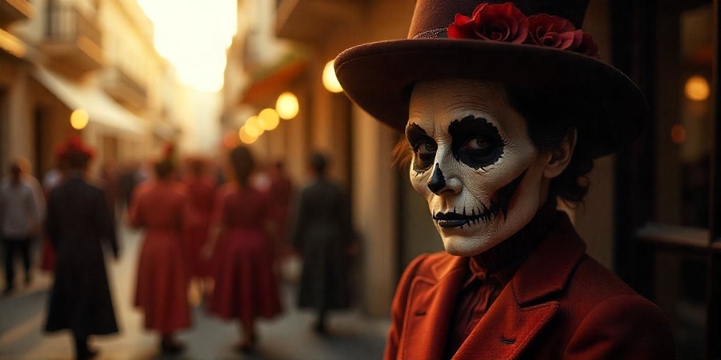 Lucía, estudiante de folklore, se infiltró en un ensayo. Vio figuras esqueléticas bailando al ritmo de tambores lúgubres. El líder llevaba la máscara restaurada por Laura.
