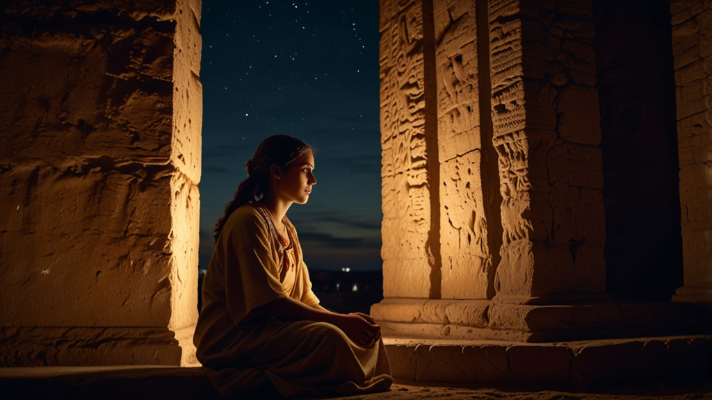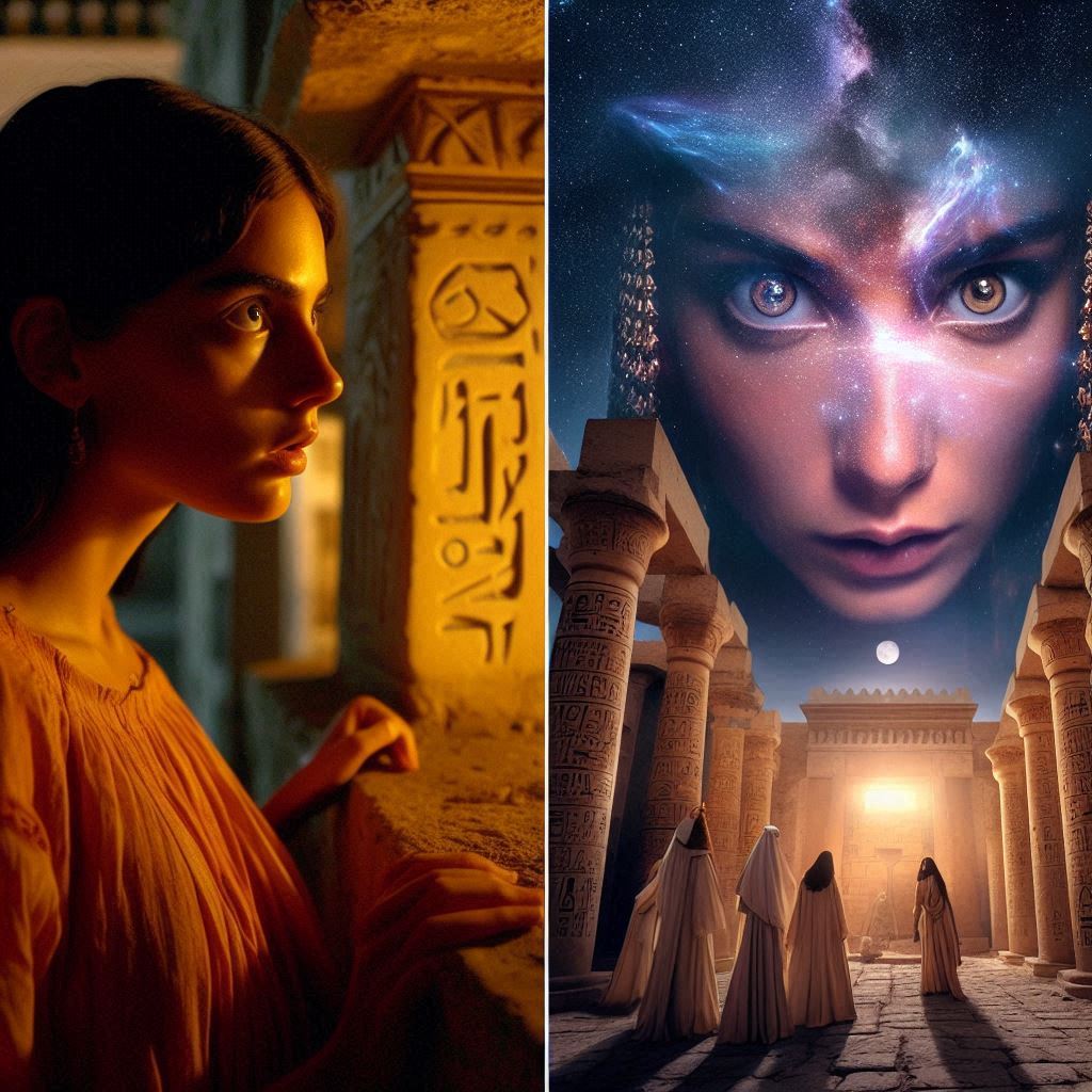 Despertó en el Templo de Hathor, en Dendera. No hubo transición: un instante en su torre, el siguiente en aquel recinto iluminado por antorchas. Un susurro lejano se filtraba entre las columnas grabadas con jeroglíficos. Una mujer de mirada antigua la contemplaba con severidad.