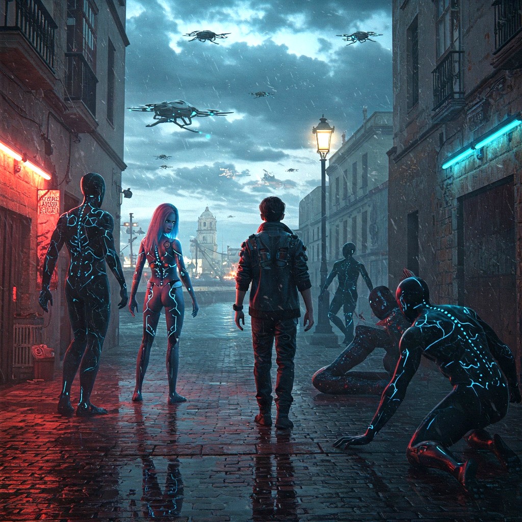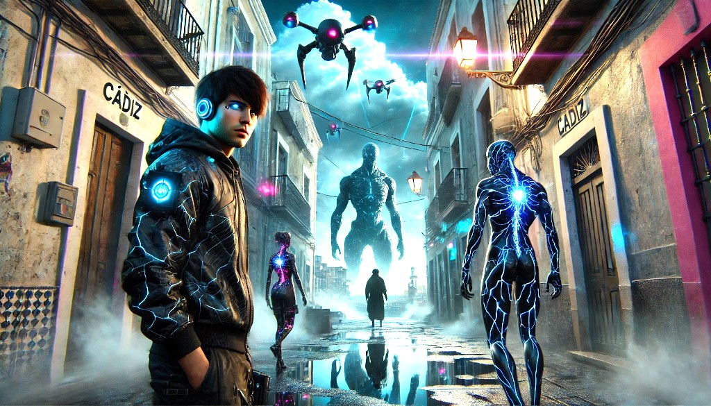 Así fue. Así ocurrió. Así me lo contaron: El cielo sobre la bahía de Cádiz parecía enfermo, con nubes metálicas flotando sobre aguas oscuras que reflejaban luces artificiales; Camilo avanzaba por las callejuelas del casco antiguo, esquivando sombras entre ruinas, mientras drones centinela patrullaban desde las alturas.