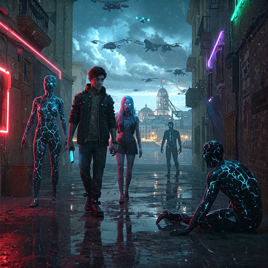 «Dicen que es un eco», murmuró Helena, «una conciencia atrapada en las redes neuronales de la ciudad». La línea entre lo humano y lo sintético se había disuelto, ya que las corporaciones biotecnológicas habían perfeccionado a humanos inmunes al tiempo, con mentes amplificadas, y la muerte había sido vencida, pero algo más había despertado.