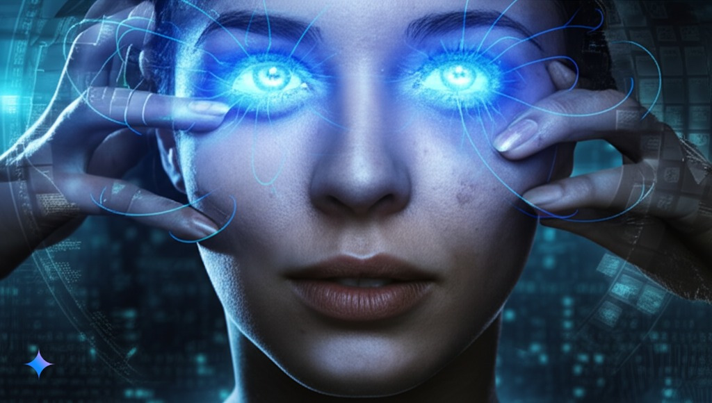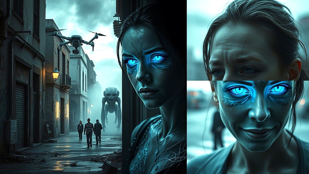 De repente, Helena apareció, su silueta recortada contra la penumbra, con ojos que brillaban antinaturalmente y piel pálida con un destello azul característico de los nanobots. «Lo has visto, ¿verdad?», cuchicheó Helena, mientras Camilo recordaba el rostro sin rostro que había visto en las aguas del puerto.