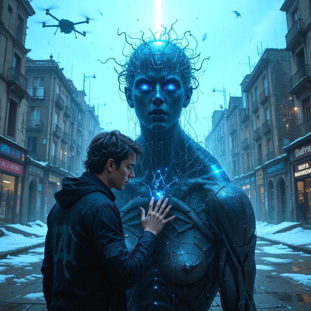 La mente de Camilo fue arrastrada hacia datos y sombras, donde vio rostros deformados, cuerpos reducidos a código y mentes atrapadas en sufrimiento eterno, y en el centro, la entidad sin forma con ojos vacíos. Helena gritó, el resplandor azul se expandió, y Camilo cayó, mientras la entidad se retorció y el murmullo cesó. Finalmente,