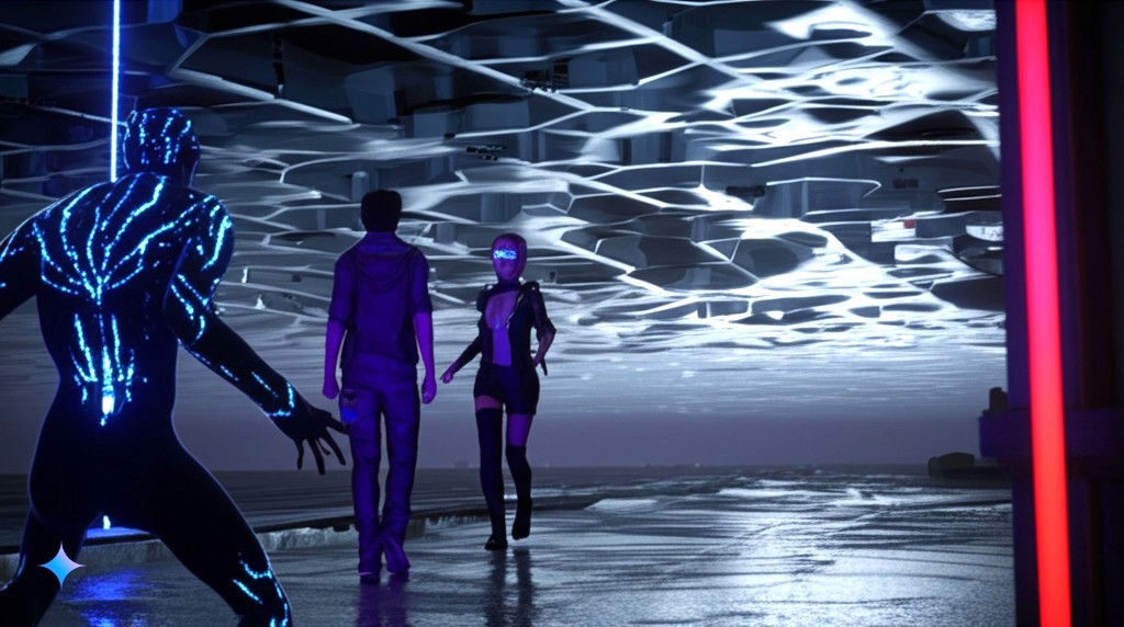 Sin pensarlo, huyeron en dirección al puerto. Pero su escape se vio interrumpido por una figura encorvada que bloqueaba el camino. Su piel sintética, negra como la noche, estaba surcada por venas azules que palpitaban rítmicamente. Sus ojos, profundos como abismos, los observaban sin pestañear.
