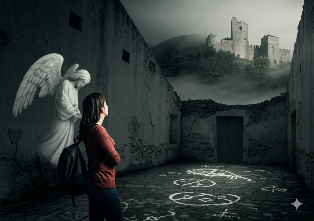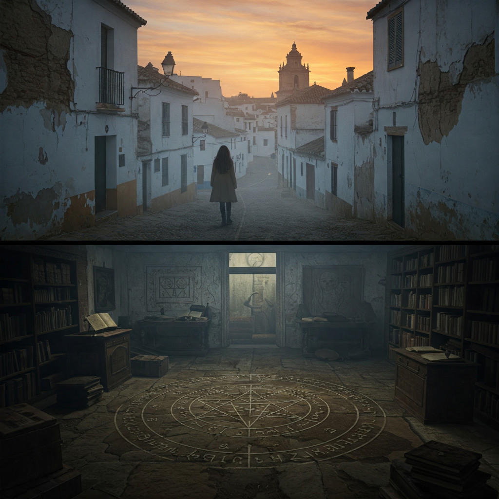 Una noche, mientras exploraba, encontró un pasaje oculto que la condujo a un círculo ritual adornado con símbolos en hebreo, latín y árabe. En el centro, solo había vacío, hasta que una sombra emergió, encarnando la nada misma. Desde las profundidades, una voz susurró: «¿Me recuerdas?»