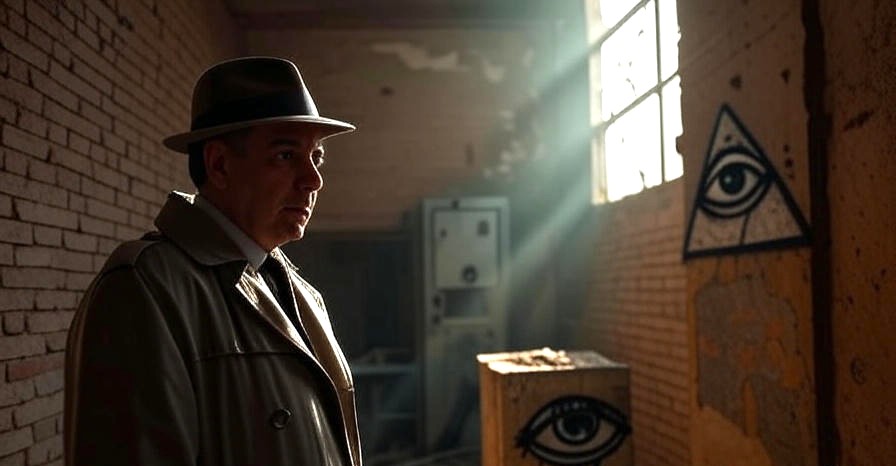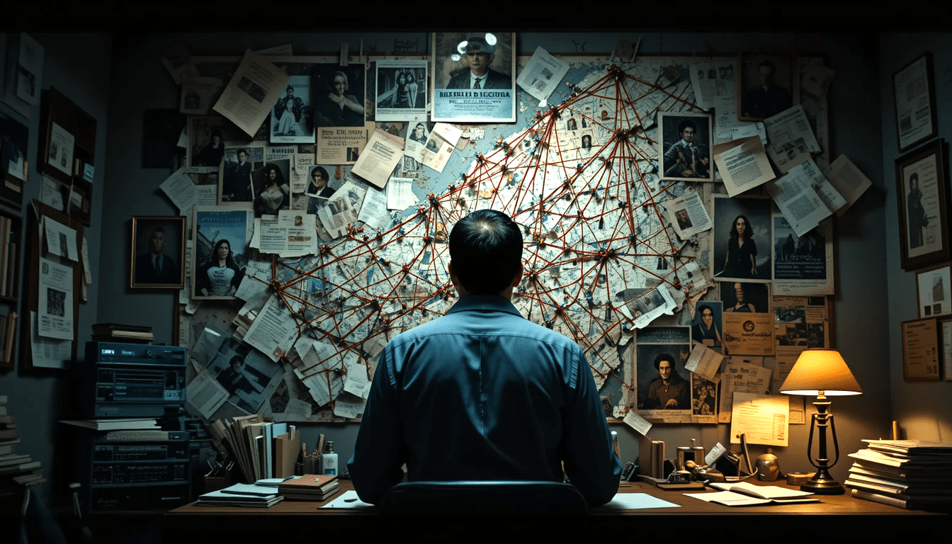 Su despacho se metamorfoseó en un verdadero santuario conspirativo; mapas plagados de chinchetas, recortes periodísticos, instantáneas y anotaciones manuscritas tapizaban las paredes cual telarañas de una mente obnubilada. Lo que otrora fuera la oficina de un inspector se había transmutado en la madriguera de un visionario al borde de la paranoia.